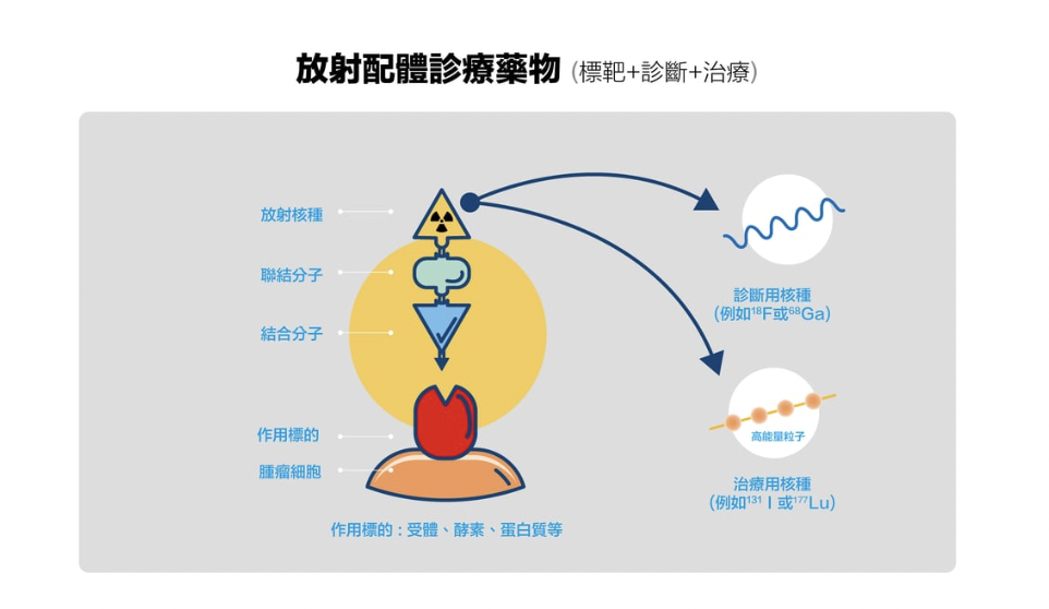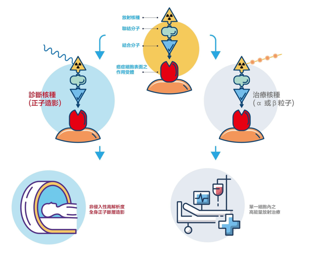 如225Ac或177Lu能釋放α粒子或β粒子,專門用來摧毀癌細胞或病變組織。這些放射性核種被設計來聚焦於癌症部位,並釋放能量以達到治療效果。