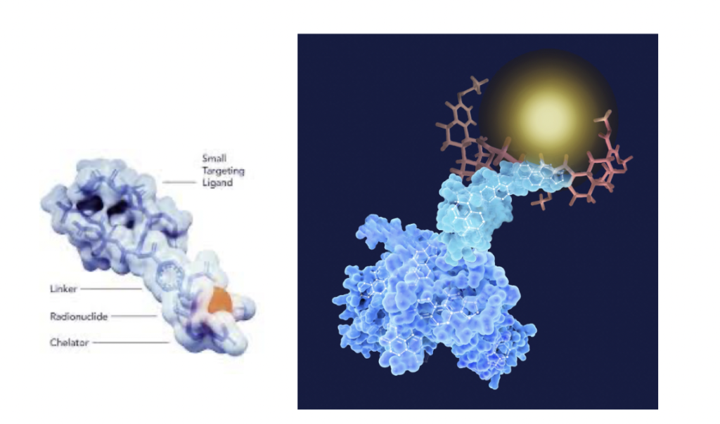其結構由連結分子(Linker)、靶向分子(Target Molecule)、螯合分子(Chelator)與放射性核種(Radionuclide)所組成:
