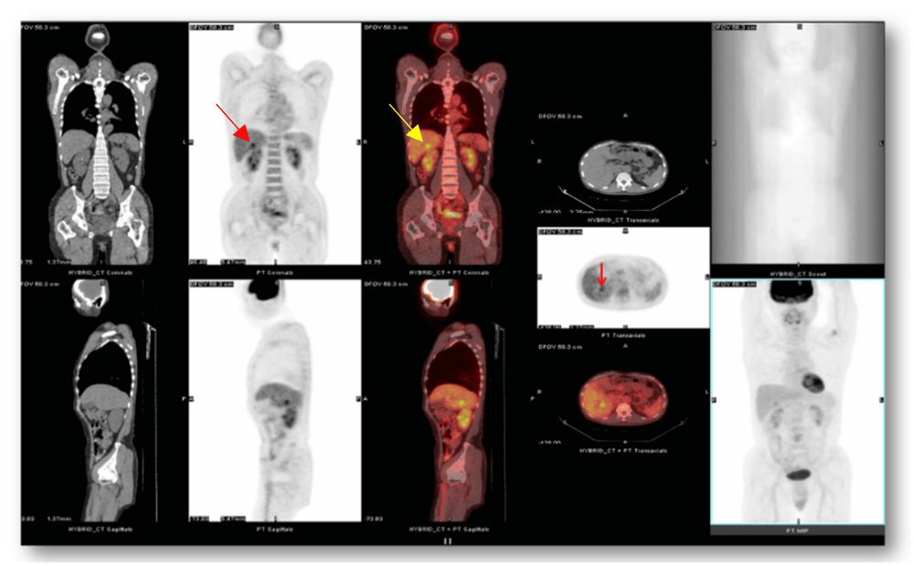 ↑ 結腸(大腸)癌患者數後多年剛發生肝臟轉移(箭頭所指處)時的F-18 FDG正子斷層攝影